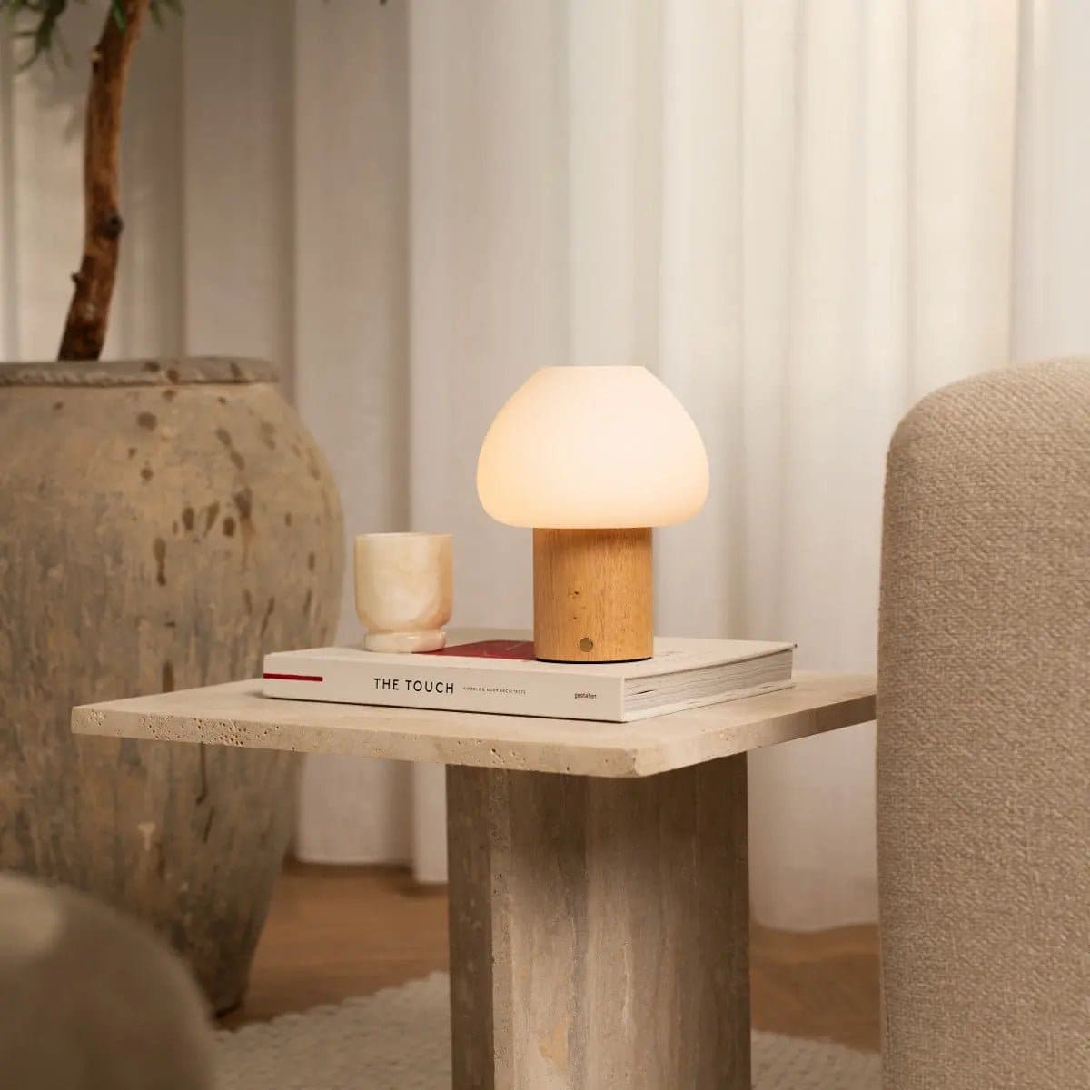 Die Fynn Tischlampe Hellbraune ist kabellos, dimmbar und stilvoll – ideal für jede Umgebung.